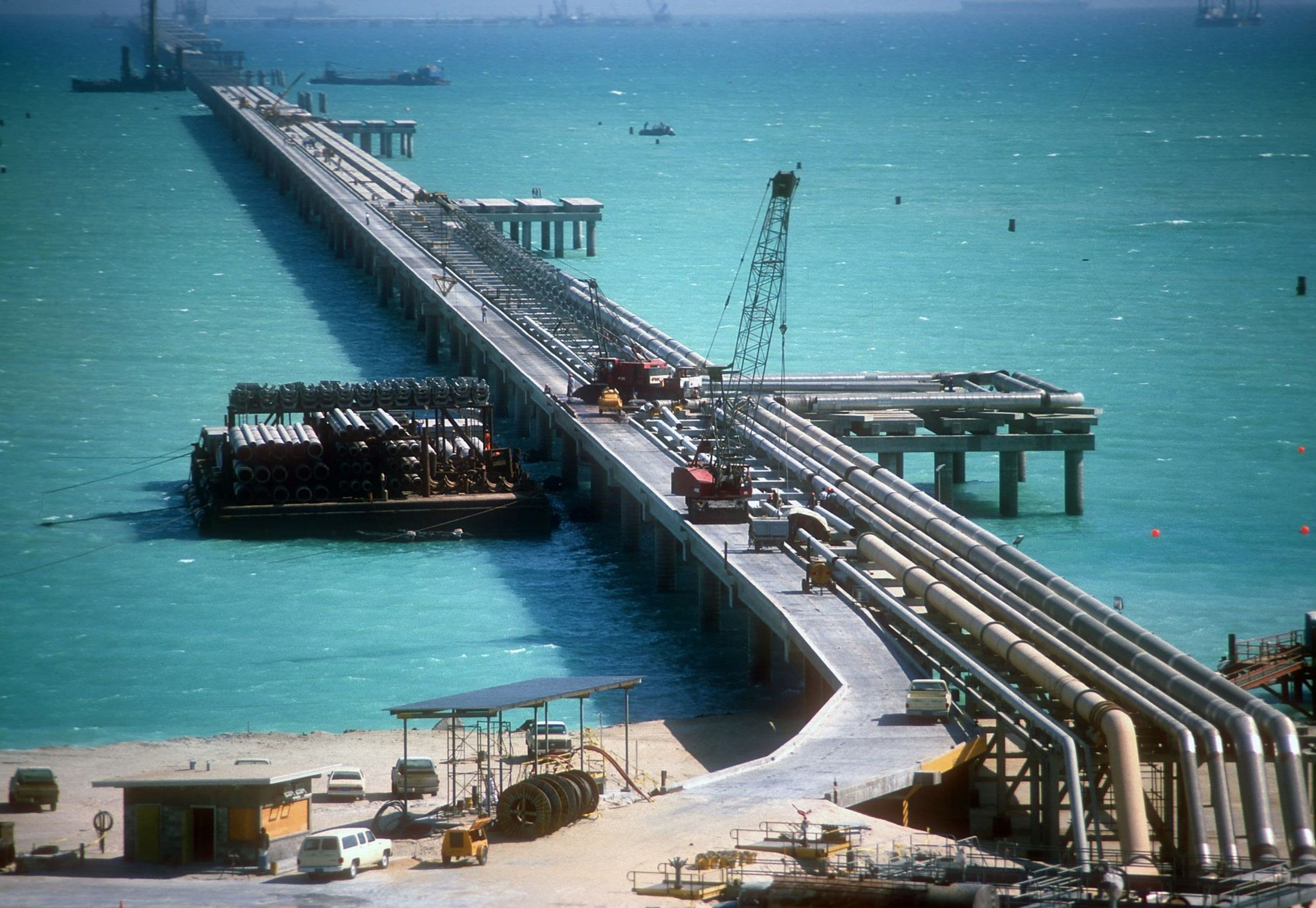 Pipelines that extend from shore to the offshore platforms include four 35,000-foot, 56-inch crude lines and two 24-inch bunkering lines. Twin 48-inch submarine crude lines and a single 18-inch bunkering line connect the offshore platforms to each of six SPMs. The SPM systems were designed to accommodate 750,000-dwt tankers.
