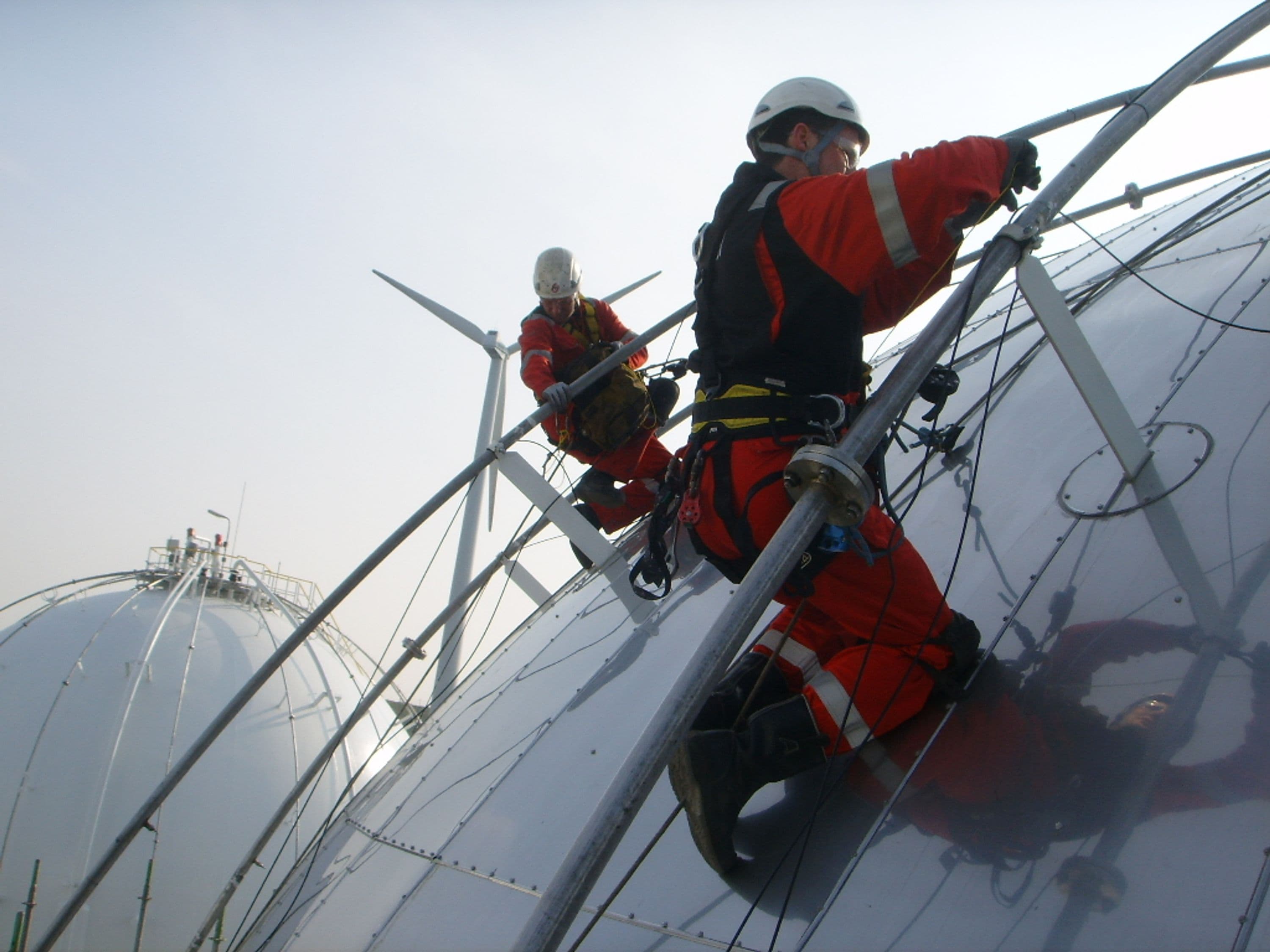 Part of the project was to select the best available cold insulation technique for the gas spheres. A complicating factor was that the cold insulation needed to be installed during wintertime. A field test, held under extreme winter conditions, was organized to test the adherence of the glued insulation elements under winter conditions. In order to create the optimum conditions for gluing of the foamglas cold insulation elements on the sphere surface, it was decided to construct a fully closed and heated enclosure around the sphere.
